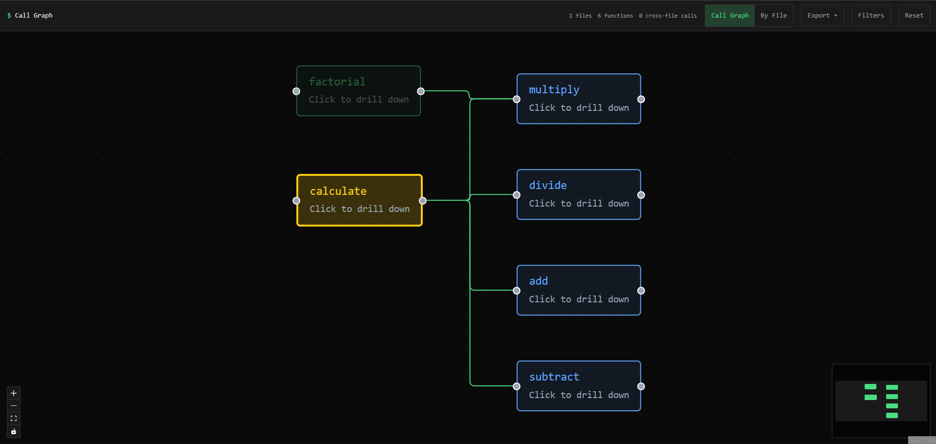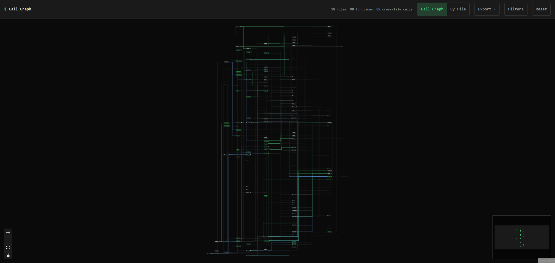 Here's what it looks like when you throw a medium-sized codebase at it (18 files, 90 functions, 89 cross-file calls):