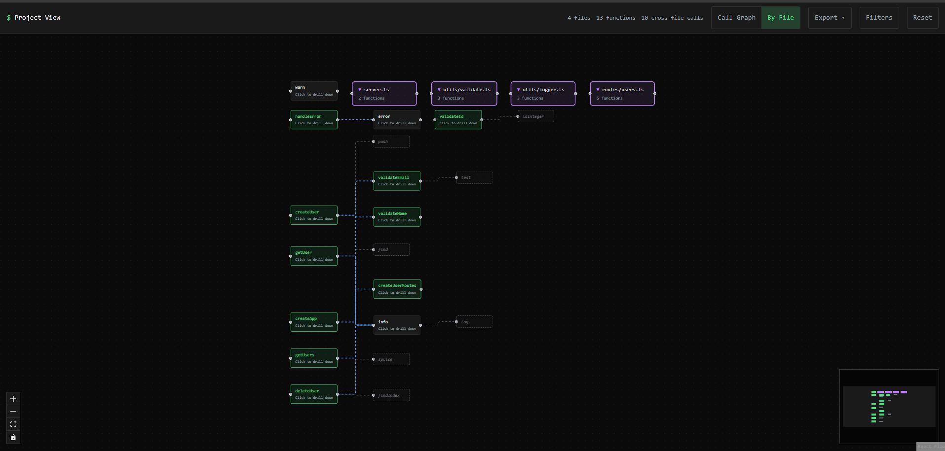 This one's a simple Express API: 4 files, 13 functions. Now I can actually follow the flow. server.ts hits the route handlers, which call into the utils for validation.