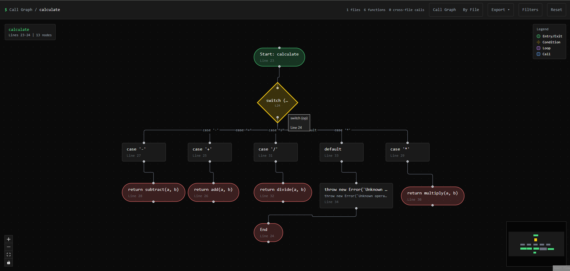 That's a calculate function with a switch statement handling five operations. Seeing the branches laid out like this is faster than mentally parsing nested conditionals.